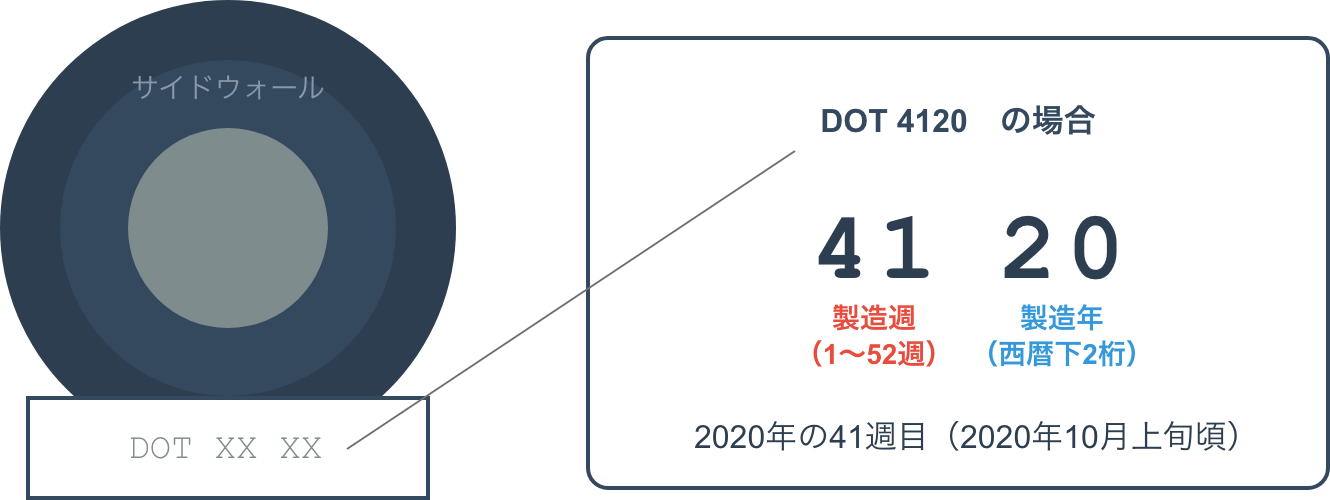 タイヤの製造年週は、サイドウォールのホイールに近い部分に刻印されています。「DOTコード」と呼ばれる英数字の末尾にある4桁の数字で確認できます。読み方は、最初の2桁が「製造週」、最後の2桁が「製造年」を表します。